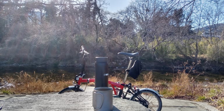 ブレロはCOMORIVERの敷地を外れたと思しきところで、石のベンチ?に腰をかけて休憩。川がすぐそばでとても気持ちいい。熱いコーヒーを飲む。