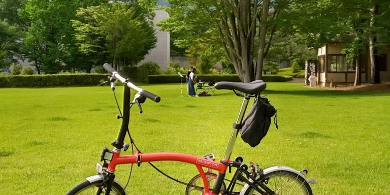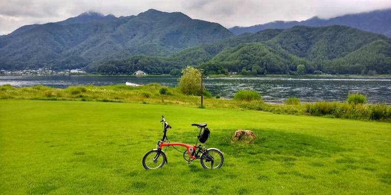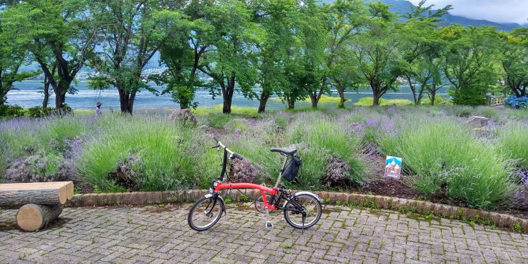 思ったよりも天気がよくなってサイクリングできるかもしれないと思い、一応、愛機のBromptonを車に積んでおいた。現地に到着したらサイクリングできそうだったので、いそいそと愛機を車から出して河口湖を一周することにした。